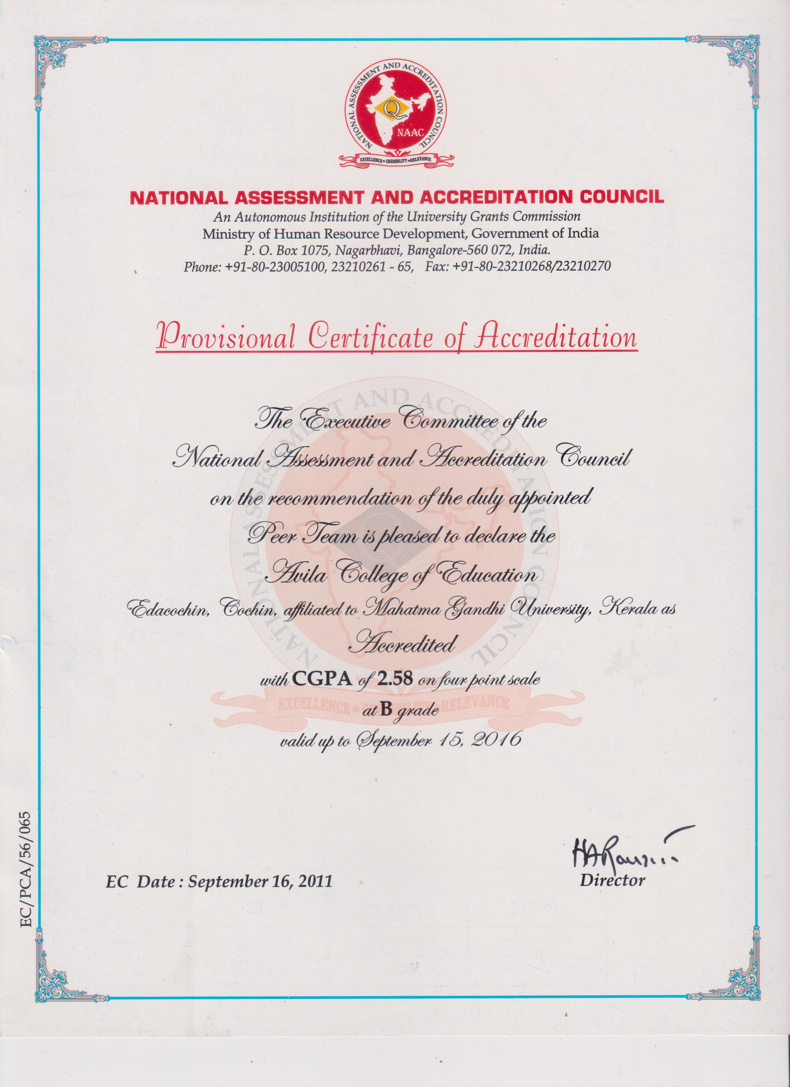 National Assessment And Accrediation Council (NAAC) Re-accredited Avila College of Education with B+ Grade in 2025